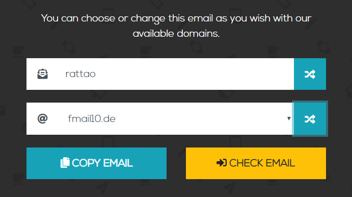 In case you can’t think of any username or can’t select any email domain, there are two blue shuffles button on the right of the two boxes. Click those two and the system will automatically generate a username and select an email domain for you. Relax, do nothing and we have here for you a new temporary email address with Tempemail!